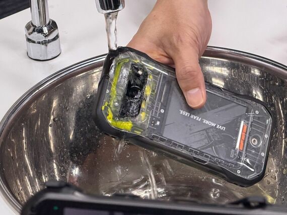 発表に先立つ内覧会では、黄色いインクを泥に見立てたデモンストレーションが行われた。透明な背面カバーを装着した端末にインクを注入し、水道水で洗い流す様子が公開された。電池パック周辺の防水領域には泥が侵入せず、それ以外の部分に入り込んだインクがスリットから排出される過程を確認できた。