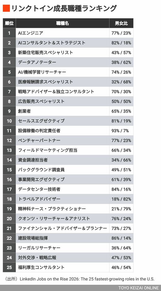 キャリア・教育 プログラマーが後退し"あの伝統職種"が急伸した必然 「アメリカ成長職種ランキングTOP25」から占う日本の未来 7分で読める 公開日時:2026/02/27 05:30 日沖 健 経営コンサルタント フォロー 1/6 PAGES 2/6 PAGES 3/6 PAGES 4/6 PAGES 5/6 PAGES 6/6 PAGES AI関連以外にも成長している職種はある