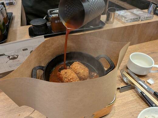 最後となる3枚目のメンチカツが登場。ここで、鍋で提供される本当の目的がわかった。メンチカツが置かれるとスタッフは鍋に油跳ねガードの紙を装着。鍋にデミグラスソースを流し込むという。「よかったら動画をどうぞ」と促されるので、カメラを向けてみた。