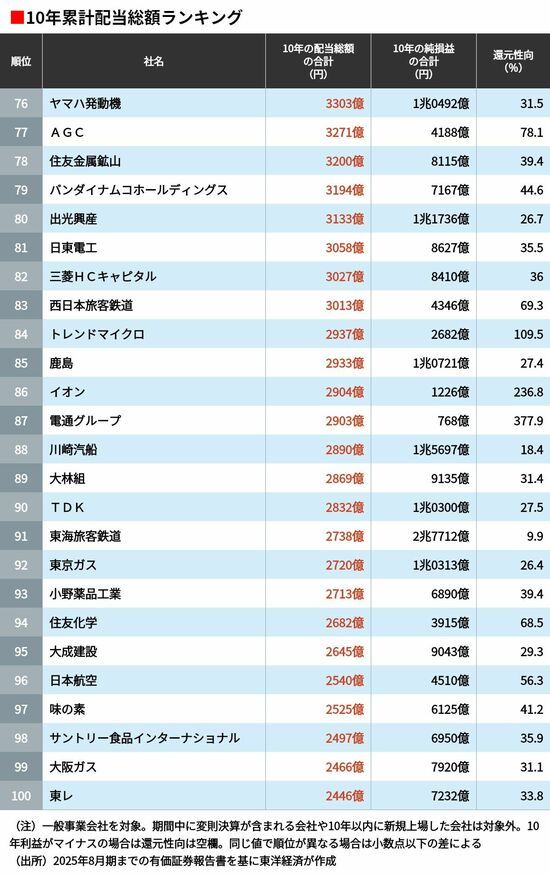 政治・経済・投資 過去10年累計「配当総額」ランキングTOP300 3位はJT、2位はNTT、では1位は? 2分で読める 公開日時:2026/02/25 05:00 田中 久貴 東洋経済データ事業局 フォロー 1/13 PAGES 2/13 PAGES 3/13 PAGES 4/13 PAGES 5/13 PAGES 76〜100位 次ページが続きます:【101〜125位】 6/13 PAGES 7/13 PAGES 8/13 PAGES 9/13 PAGES 10/13 PAGES 11/13 PAGES 12/13 PAGES 13/13 PAGES