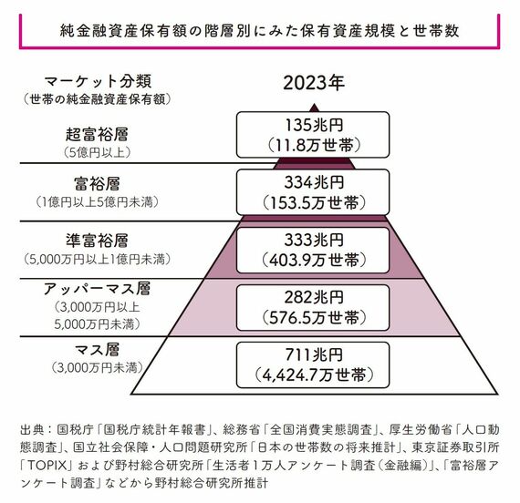 いわゆる、お金持ち(下の図にあるような「準富裕層(資産5000万円以上)」や「富裕層(資産1億円以上)」)になって自由な人生を手にするために、株式投資をやろうとする人が多いのは自然なことです。