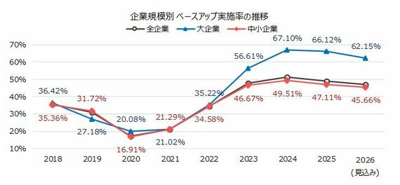 企業規模別のベースアップ実施率の推移をみると、大企業と中小企業で規模による格差が開き始めたのは2023年度以降だ。