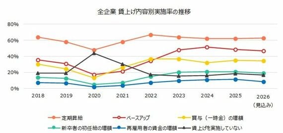 コロナ禍前の実施率と比較し、変化が目立つのは「ベースアップ」だ。2023年度には47.8%へ大きく上昇、2024年度は51.4%と半数を超えた。その後、2025年度48.8%、2026年度(見込み)46.8%と、やや低下したが、3割台で推移していたコロナ禍前の水準を大きく上回り、構造的な賃金底上げの動きが広がっていることがうかがえる。