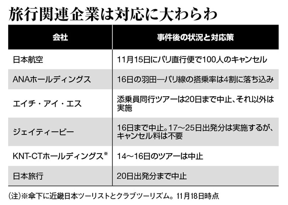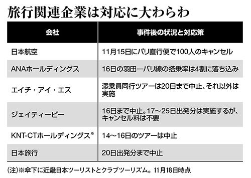 燃油安の恩恵を享受し、株価も堅調だった日本航空(JAL)は、16日に3%の下落に見舞われた。同社は羽田と成田の両空港からパリへの直行便を1日1便ずつ運航。両便合わせて約400席あるうち、15日はその4分の1に当たる、約100人のキャンセルが発生した。