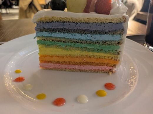 まず運ばれてきたのは、レインボーショートケーキ。薄暗い空間でもなかなかに目立つカラーリングの断面である。プレートにあしらわれたソースもまたカラフルである。