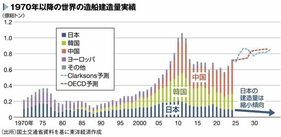 11年には、リーマンショック前に受注・生産開始された船が世界的に大量に出回り、世界の建造量は過去最大となった。だが反動の「船余り」で22年の建造量はほぼ半減。日本では同年12月に三菱重工業が長崎の香焼工場の新造船エリアを大島造船所に売却するなど、再編・縮小の嵐が吹き荒れた。その後遺症もあり業界の高齢化と人手不足が進み、生産設備も脆弱になっている。