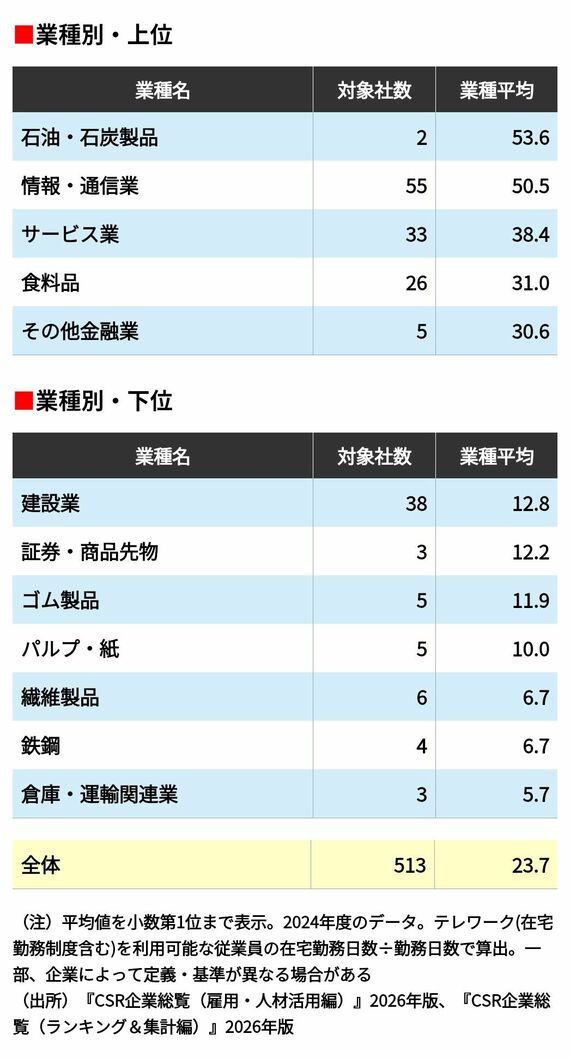 テレワークの利用実績は、有給休暇取得率と並び、人材を惹きつけるための重要な要素になっている。業種平均をみると情報通信業の50.5%に対して、建設業は12.8%と業種によって開きがあるが、ランキング上位企業にも下位業種の企業もあり、一部の職種だけに特有なものではなくなっていることが見て取れる。
