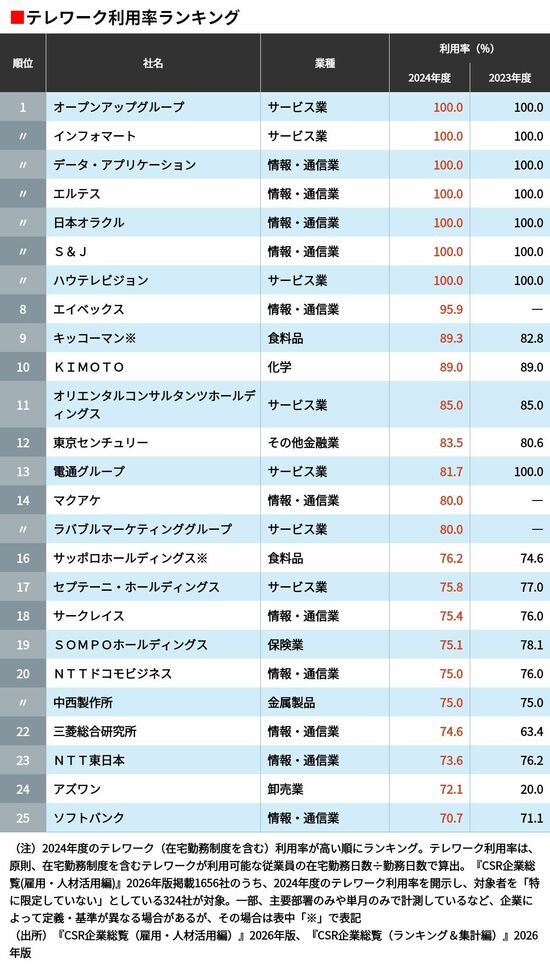 ビジネス #CSR企業総覧 前の記事 次の記事 電通グループなど少しずつ出社に回帰する企業も…「テレワーク利用率」が高い企業ランキングTOP100 5分で読める 公開日時:2026/02/27 06:00 田中 久貴 東洋経済データ事業局 フォロー 1/6 PAGES 2/6 PAGES 3/6 PAGES 1〜25位 次ページが続きます:【26〜50位】 4/6 PAGES 5/6 PAGES 6/6 PAGES