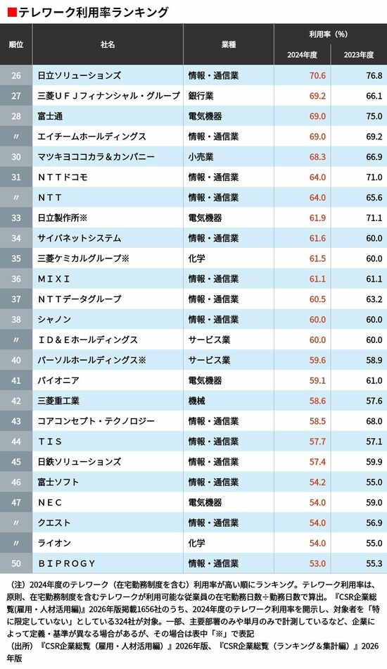 ビジネス #CSR企業総覧 前の記事 次の記事 電通グループなど少しずつ出社に回帰する企業も…「テレワーク利用率」が高い企業ランキングTOP100 5分で読める 公開日時:2026/02/27 06:00 田中 久貴 東洋経済データ事業局 フォロー 1/6 PAGES 2/6 PAGES 3/6 PAGES 4/6 PAGES 26〜50位 次ページが続きます:【51~75位】 5/6 PAGES 6/6 PAGES