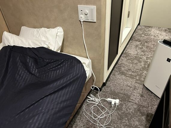 窓の外は隣のビルの壁だったため、室内はやや暗めだった。これが格安の理由かもしれない。ネイビーのカーテンとシーツも相まって、落ち着いた雰囲気だ。