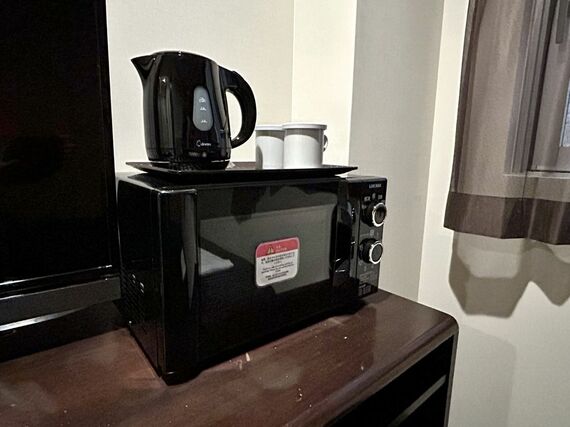 部屋には、電子レンジ、冷蔵庫、電気ケトルがあり、飲食の自由度が高い。徒歩2分圏内にはコンビニやスーパーがあり、欲しいものがあればすぐに調達できる。