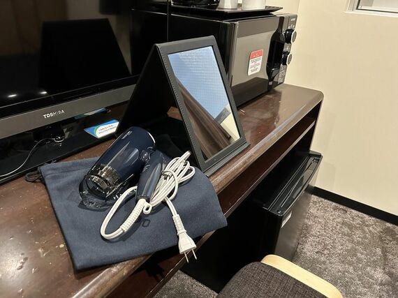 デスクの下にあった、ドライヤーと卓上ミラー(写真:筆者撮影)