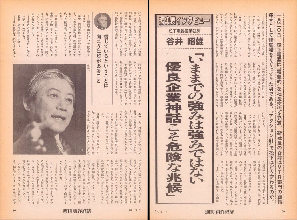 谷井:ちょっとオーバーですよ。 私個人としては、松下に入社してからいろいろとやってきましたが、ビデオを担当する前はオーディオ関係のテープレコーダーの事業部長をしておった。 ビデオにかわりましたのは、昭和47年の暮れでした。