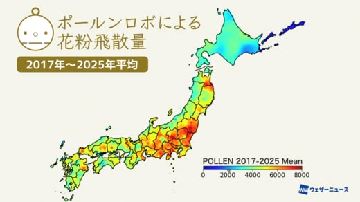 このなかで、ウェザーニューズが全国に設置している独自の花粉観測機「ポールンロボ」による観測に基づいて解析された2017〜2025年の花粉飛散の平均値を表した日本地図が紹介されており、飛散量の分布が手にとるようにわかる。