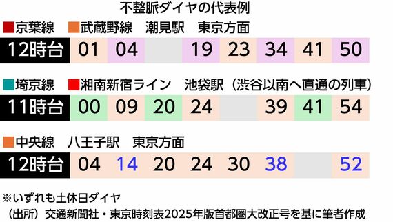 ここまで述べてきた「路線間の列車接続」や「不整脈ダイヤ」といった問題が生じる原因は、同一ホーム接続駅・路線で時刻や本数をそろえる仕組みがないこと、首都圏ネットワーク全体でダイヤのサイクルを統一していないことにある。