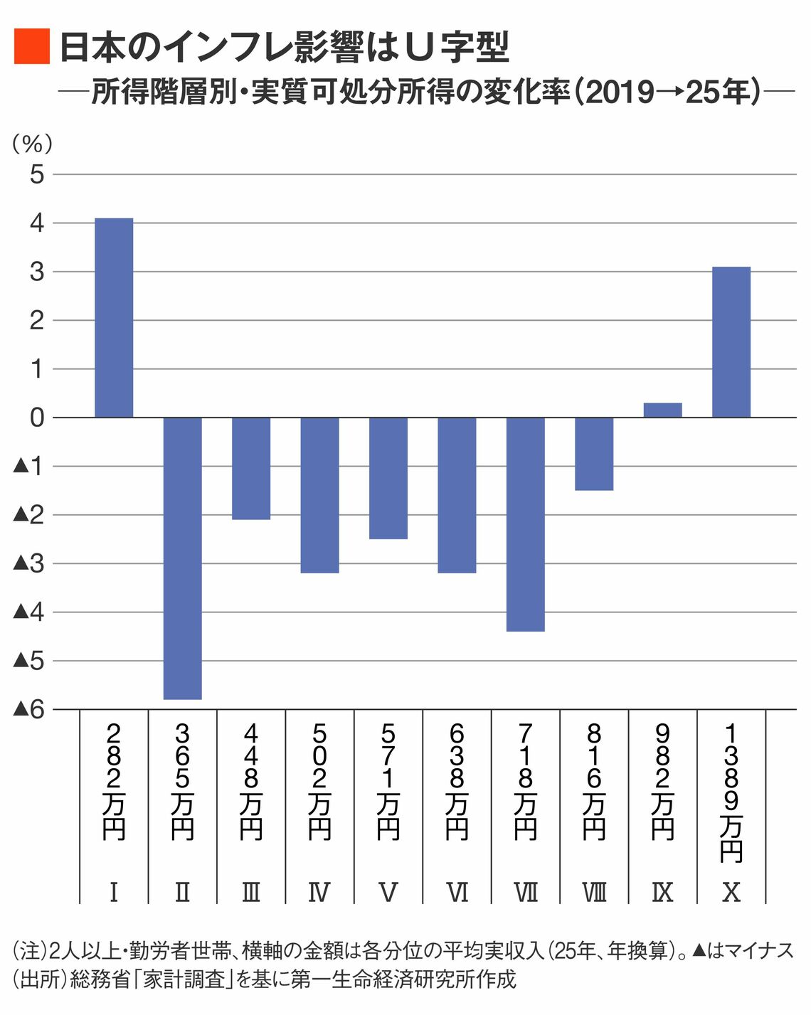 図では総務省の「家計調査」を用いて、収入十分位別(世帯数が10分の1ずつになるように収入階級を10に分類)に世帯ごとの実質可処分所得のコロナ前からの変化(2019→25年)をまとめている。