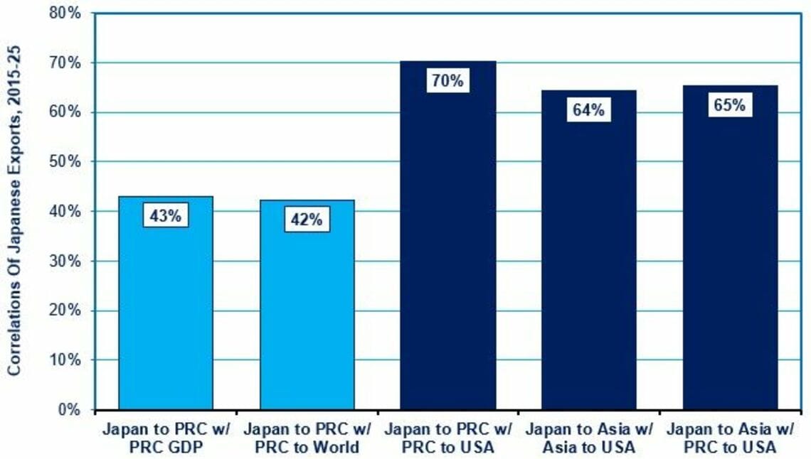 The dark blue column in the middle of the chart below shows a high 70% correlation between Japan’s exports to China and the latter’s exports to the US. By contrast, the two light blue columns on the left show a much lower correlation between Japan’s exports to China and either China’s internal growth in GDP (just 43%) or its global exports (just 42%).