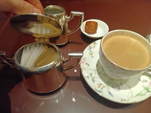 10分ほど経った頃、とてもいい香りがするコーヒーが運ばれてきた。銀色の食器に入れられたミルクと砂糖(白色と茶色の2種類から選べる)、一口サイズの洋菓子もセットで付いてきて、まさに“貴族のコーヒータイム”といった光景が目の前に広がる。