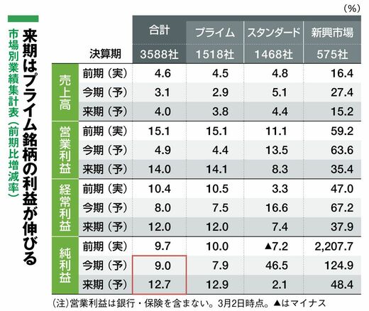 それでも日本企業の業績は好調だ。3月18日発売の『会社四季報』2026年2集春号の最新集計によると、上場企業の今期純利益は9.0%の増益となる見通しだ。さらに来期は12.7%増と、大幅増益を見込む。今期不振の鉄鋼や輸送用機器が回復し、3カ月前の新春号の7.7%増から拡大した。