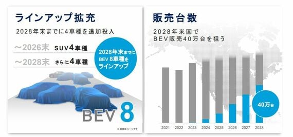 その中で、「28年までにバッテリーEVを4車種追加し、26年度末までに投入することを公表済みの4車種(SUV)に加えて、合計8車種のバッテリーEVをラインアップ」、さらに「アメリカでのバッテリーEV販売40万台を狙う」としていた。