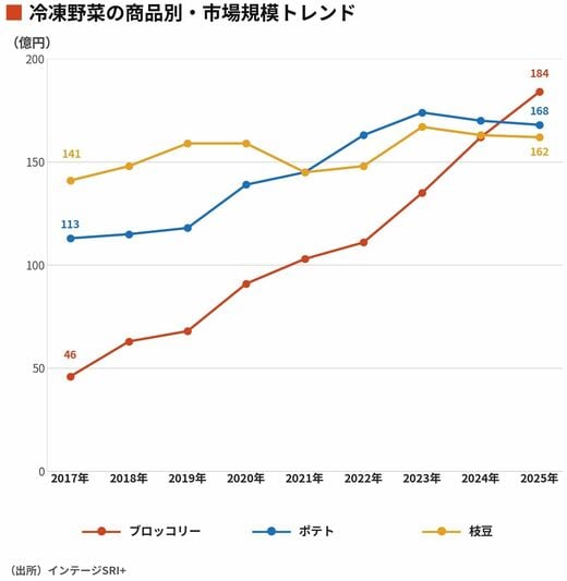 全国のスーパー、コンビニ、ドラッグストアなど約6000店舗の販売動向を追う「インテージSRI+」のデータが、その変化を数字で裏付けている。冷凍ブロッコリーの市場規模は2025年に184億円に達し、2017年比で実に約4倍。長年トップに君臨してきた枝豆とポテトをともに抜き去り、冷凍野菜の首位に立った。