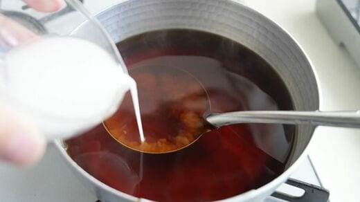 うどんダシに水溶き片栗粉を加え、中火にかけて混ぜながら煮立てます。片栗粉に火が通ると、うどんつゆにとろみがつきます。