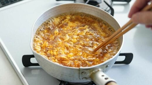 すべての卵を入れ終えたら、そのまま沸かして卵に火を通します。とろみはつゆの対流を穏やかにする効果があるので、つゆの中に卵が散らばることも防げ、ふんわりと仕上がるわけです。