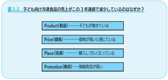 課題を多角的に分析するためには、マーケティングの基本である「4P」に分けて考える方法が効果的です。
