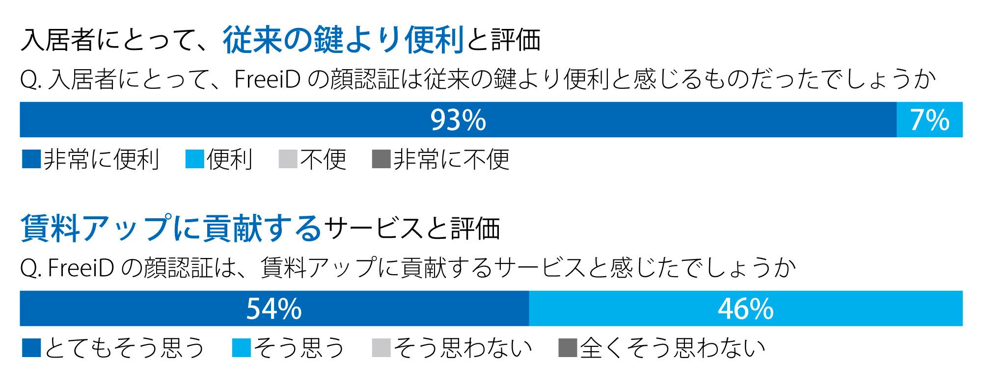 國生 入居者アンケートを重ねたところ、FreeiDがあるか無いかによって、家賃の価値換算は1万円程度変わると約半数の方が回答されました。中には「FreeiDが無い物件にはもう住みたくない」という方までいらっしゃるほどです。多くのご入居者様にとって、家賃だけでなく利便性やセキュリティーは重視すべきポイントであることがうかがえます。