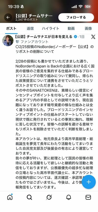 また、「【公認】チームサナエが日本を変える」と題するXアカウントでも、Japan is backやサナエトークンに対して「この取り組みに共感し、我々のVeanas号(筆者注:ワゴン車で全国を縦断して高市氏を応援する内容)での活動と連携をして、共に日本の明るい未来を紡いでいきたい」と投稿されていた。
