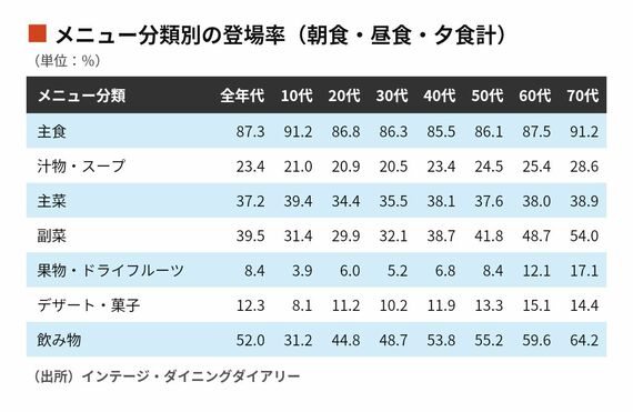 3食全体でみると、10代の主食登場率は91.2%と70代と並んで最も高く、主菜の登場率39.4%は全世代トップだ。一方、汁物・スープ、副菜、果物・ドライフルーツ、飲み物の登場率は70代で最も高い。10代では主食と主菜が前に出るのに対し、70代では副菜や果物、飲み物まで含めて食卓を構成している点が特徴的だ。