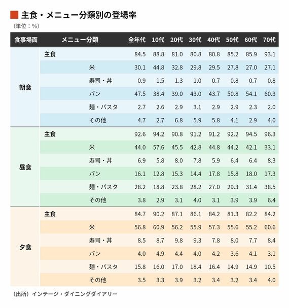一方、70代は朝食でパンが60.3%と、コメの27.1%を大きく上回る。昼食では麺・パスタが38.5%と全世代で最も高くなり、夕食ではコメが60.6%と10代に近い水準まで上がる。朝はパン、昼は麺、夜はコメと、食事ごとに主食を使い分けている姿が浮かぶ。
