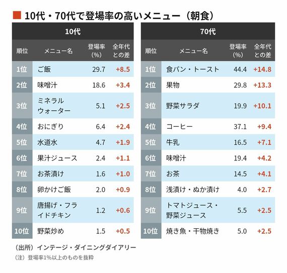 ここからは、朝食・昼食・夕食ごとに、10代と70代で登場率の高かったメニューをみていく。