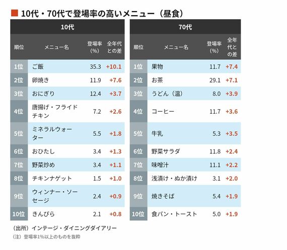 10代の昼食は卵焼きや唐揚げ、70代はお昼も果物