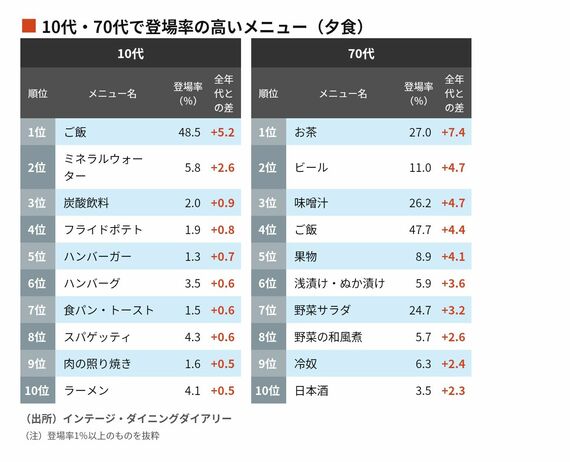 一方、70代の夕食は1位がお茶、2位がビール、10位が日本酒だった。浅漬け・ぬか漬け(6位)、冷奴(9位)も上位に入っている。主食ではご飯が4位、味噌汁が3位に入り、昼食で目立った麺類から、夕食ではコメ中心の構成に変化している。お茶を含め、お酒も楽しむ夕食ならではの顔ぶれだ。