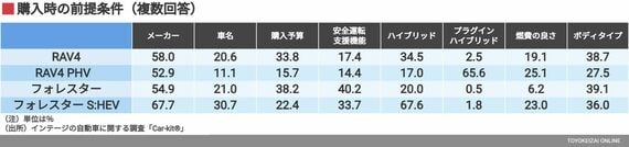 RAV4 PHV、フォレスター S:HEVは「燃費の良さ」も条件として挙げており、購入後のランニングコストにも意識が向いていることがわかる。