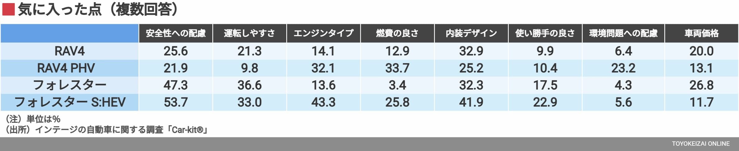 「気に入った点」を見ると、RAV4とフォレスターは同じミドルSUVでも、購入時に「良かった」と評価されるポイントがかなり違う。例えばフォレスターは、「安全性への配慮」が高く、それぞれ50%ほどに達するのだ。