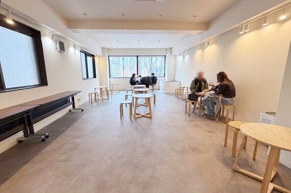もっとも不満がないわけではありません。2階のカフェスペースは、クッションもない丸椅子と会議室にあるような長机が置いてあるだけ。しかも、丸椅子は富士貿易と思しきもので、これはAmazonで2000円ぐらいで購入できます。