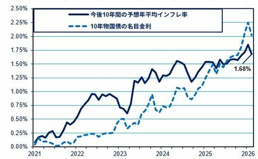 2月末時点での今後10年間の予想インフレ率はわずか1.68%だ。また、投資家が予想する「実質金利」は0.35%に過ぎない。経済の停滞により、供給に対して資金需要が弱いことが背景にある。高市政権による国債増発の必要性をもってしても、この基本的な構図を変えるには至っていない。