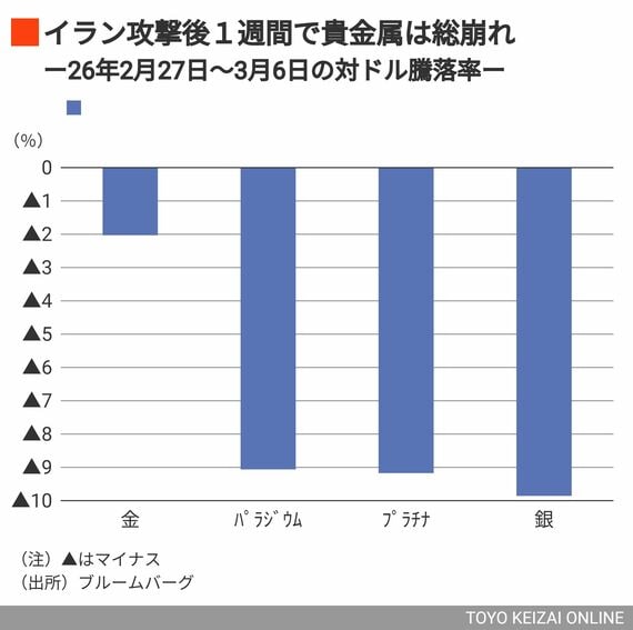 このほか、近年、基軸通貨ドルの代替として無国籍通貨である金を筆頭に貴金属の稀少性が注目されてきたが、イラン攻撃後の1週間(26年2月27日~26年3月6日)に着目すれば、対ドルで金は2%下落、パラジウムは9.1%下落、プラチナは9.2%下落、銀は9.9%下落と総崩れである。