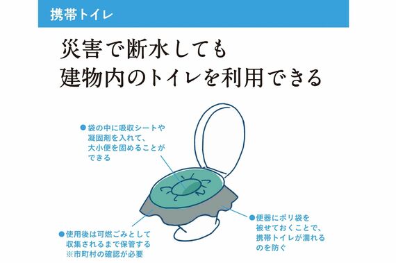 携帯トイレとは、建物内の便器に取り付けて使用する袋タイプのトイレで、袋内で吸収剤(凝固剤タイプや吸収シートタイプなどがある)を用いて、安定化させて保管します。自治体の確認は必要ですが、多くは可燃ごみとして廃棄することが可能です。