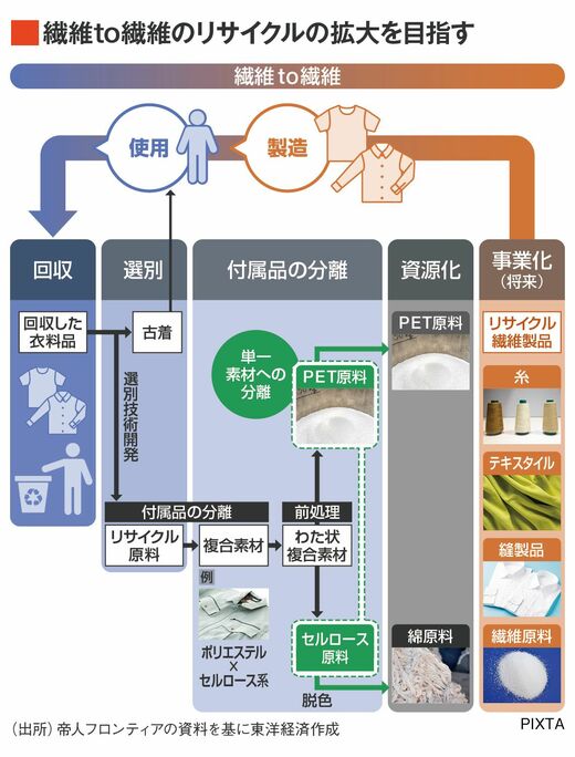 繊維大手・帝人フロンティアはじめ、繊維業界がリサイクル拡大の仕組みづくりを急いでいる。目前に迫るEU(欧州連合)の規制への対応が迫られており、取り組みが遅れれば欧州市場から駆逐されてしまう経営リスクすら抱える。国も先がけて公共調達で需要創出を図るなどの施策で後押しし、国際競争力の維持へ挑戦する。