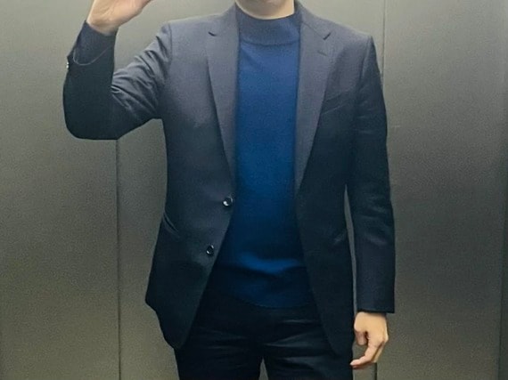 一方、オフィスカジュアルが許容される職場であれば、もはや「ワイシャツを着るのをやめる」という根本的な解決策も極めて効果的です。いわゆるジャケットのインナーとして、シャツ感覚でビジネスニットを直接合わせる着こなしです。