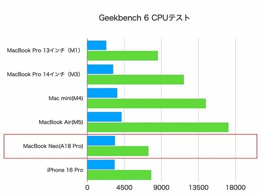 このため、性能は最新のMacBook Airに比べるとかなり低い。以下はベンチマークソフトでのテスト結果だが、M5版MacBook AirとMacBook Neoでは、2倍を大きく超える差が生まれる。倍の価格だが性能が倍以上違う、と考えると、実はMacBook Airのコストパフォーマンスが非常に良い……という見方もできるのだ。
