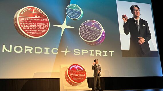 この日発表された新商品は、「ノルディックスピリット」と名付けられた「オーラルたばこ」の新ブランド。オーラルたばこは、唇と歯茎の間にパウチを挟み味や香りを楽しむ、RRP(健康リスクを低減させる可能性があるたばこ製品)の1つだ。