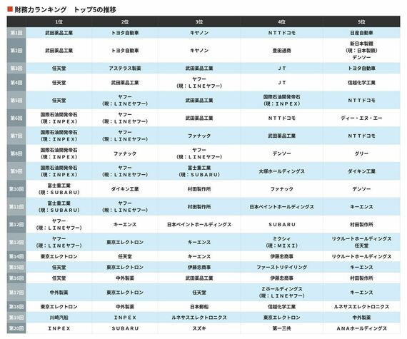 最後に過去20回のランキングトップ企業の現状をご紹介する。第1・2回トップの武田薬品工業は101位(3436点)。同3~5回など過去5度のトップを誇る任天堂は、今回は68位(3513点)。ただ、次回対象となる26年3月期はスイッチ2の大ヒットで売り上げが倍増の見込み。順位も急回復が予想される。同12・13回トップのLINEヤフーは28位(3611点)。昨年(同19回)トップだった川崎汽船は14位(3670点)だった。