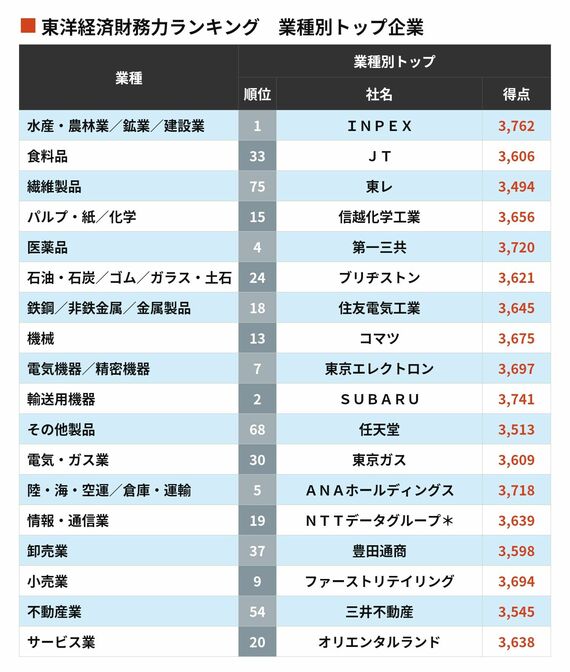 小売業ではファーストリテイリング(同9位)が、サービス業ではオリエンタルランド(同20位)がそれぞれ業界を牽引。インバウンドやリベンジ消費の恩恵を受けた企業が財務面でも強さを発揮している。
