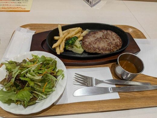 ハンバーグの方は、注文したあとに手ごねされていると思われる。実際に筆者が注文した後、厨房でスタッフがこね始めていた。鉄板で提供されるものの、ジュージュー感はそんなにない。油が飛ばないという意味ではありがたい。