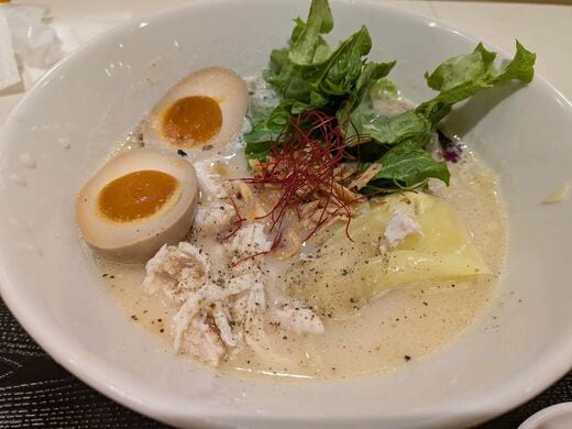 アツアツのハンバーグを冷ましがてら、特選 鶏白湯塩そばにも箸を伸ばす。麺は中太のちぢれ麺で、濃厚なスープが良く絡んでいる。レンゲですくってスープだけを飲むと、濃すぎるくらいにこれでもかというほどの鶏の旨味の暴力を感じる。おいしい。