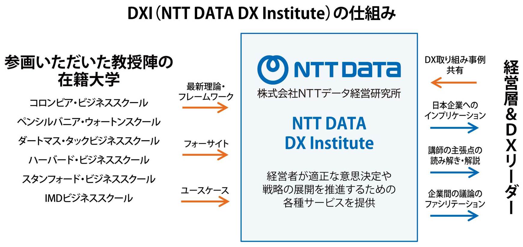 「欧米でも既存企業の多くは、ビジネスの成長につながるDXやAX(AIトランスフォーメーション)については苦労しており、ビジネススクールでもDX・AXを成功させる体系的な方法論作りに取り組んでいます。私はそれらの体系的方法論を日本に紹介し、実際の経験や日本企業の事情を加味してひもとき、議論し、学ぶ場として、NTT DATA DX Institute(以下、DXI)を2023年に開始しました」